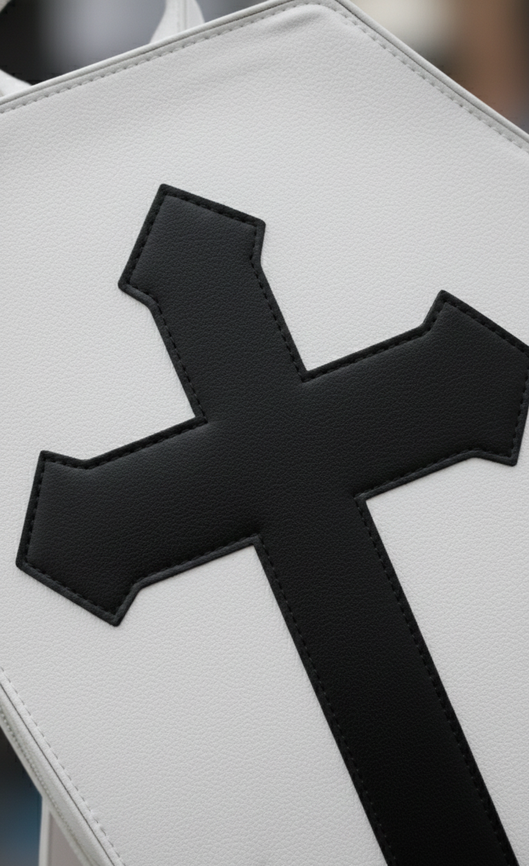 A bold departure from traditional leather goods, the "Eternal Rest" backpack redefines utility through a dark, sculptural lens. This piece features a rigid, coffin-shaped silhouette that serves as a wearable art piece, merging high-concept design with the raw energy of underground gothic culture.